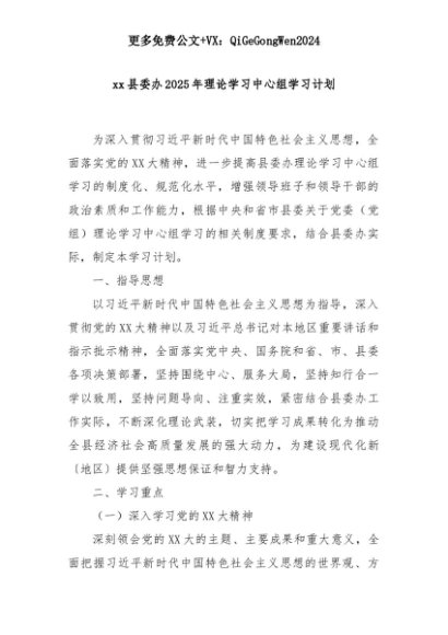 【七哥公文】2025年:xx县委办2025年理论学习中心组学习计划+更多免费公文+VX:QiGeGongWen2024+更多免费公文+VX:QiGeGongWen2024