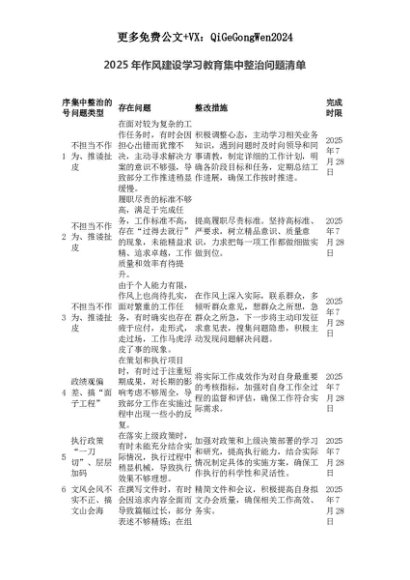 【七哥公文】2025年:2025年作风建设学习教育集中整治问题清单+更多免费公文+VX:QiGeGongWen2024+更多免费公文+VX:QiGeGongWen2024