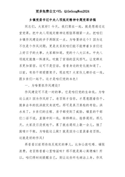 【七哥公文】2025年:乡镇党委书记中央八项规定精神专题党课讲稿+更多免费公文+VX:QiGeGongWen2024+更多免费公文+VX:QiGeGongWen2024