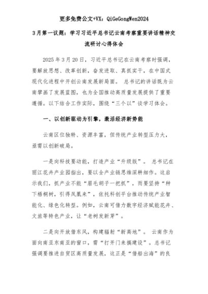【七哥公文】2025年:3月第一议题:学习习近平总书记云南考察重要讲话精神交流研讨心得体会+更多免费公文+VX:QiGeGongWen2024+更多免费公文+VX:QiGeGongWen2024