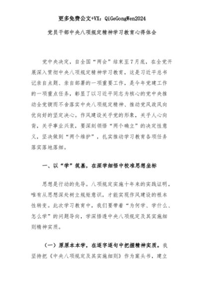 【七哥公文】2025年:党员干部中央八项规定精神学习教育心得体会+更多免费公文+VX:QiGeGongWen2024+更多免费公文+VX:QiGeGongWen2024