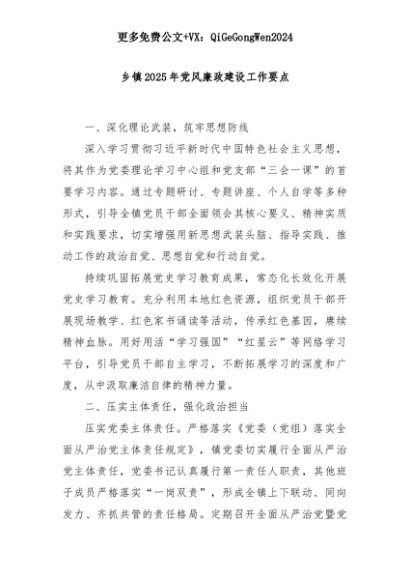 【七哥公文】2025年:乡镇2025年党风廉政建设工作要点+更多免费公文+VX:QiGeGongWen2024+更多免费公文+VX:QiGeGongWen2024