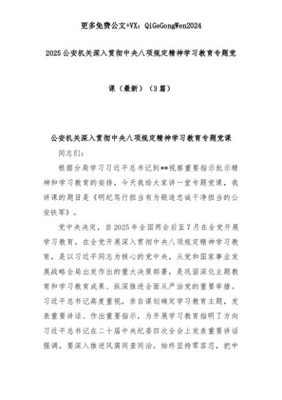 【七哥公文】2025年:(3篇)2025公安机关深入贯彻中央八项规定精神学习教育专题党课(最新)+更多免费公文+VX:QiGeGongWen2024+更多免费公文+VX:QiGeGongWen2024