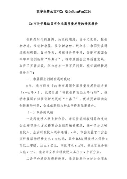 【七哥公文】2025年:Xx市关于推动国有企业高质量发展的情况报告+更多免费公文+VX:QiGeGongWen2024+更多免费公文+VX:QiGeGongWen2024