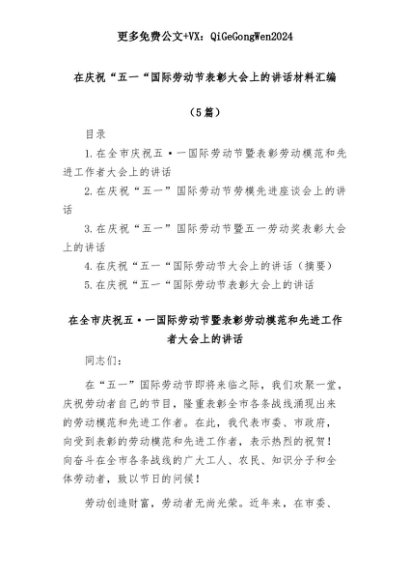 【七哥公文】2025年:(5篇)在庆祝“五一“国际劳动节表彰大会上的讲话材料汇编+更多免费公文+VX:QiGeGongWen2024+更多免费公文+VX:QiGeGongWen2024