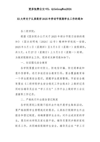 【七哥公文】2025年:XX大学关于认真做好2025年劳动节假期学生工作的通知+更多免费公文+VX:QiGeGongWen2024+更多免费公文+VX:QiGeGongWen2024