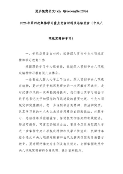 【七哥公文】2025年:2025年第四次集体学习重点发言材料及总结发言(中央八项规定精神学习)+更多免费公文+VX:QiGeGongWen2024+更多免费公文+VX:QiGeGongWen2024