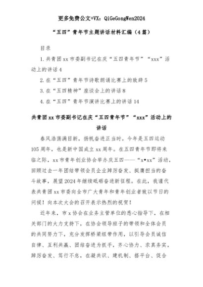 【七哥公文】2025年:(4篇)“五四”青年节主题讲话材料汇编+更多免费公文+VX:QiGeGongWen2024+更多免费公文+VX:QiGeGongWen2024