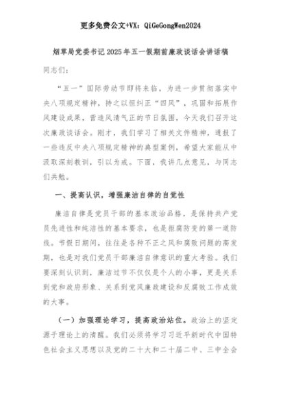 【七哥公文】2025年:烟草局党委书记2025年五一假期前廉政谈话会讲话稿+更多免费公文+VX:QiGeGongWen2024+更多免费公文+VX:QiGeGongWen2024