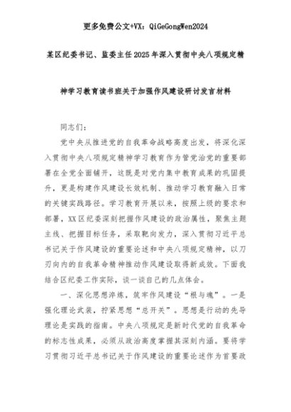 【七哥公文】2025年:某区纪委书记、监委主任2025年深入贯彻中央八项规定精神学习教育读书班关于加强作风建设研讨发言材料+更多免费公文+VX:QiGeGongWen2024+更多免费公文+VX:QiGeGongWen2024
