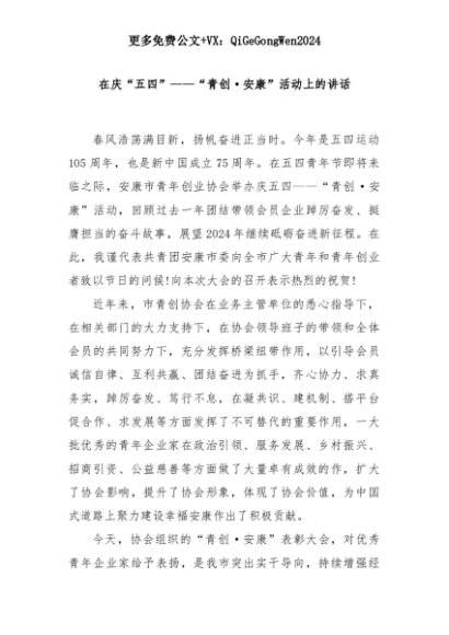 【七哥公文】2025年:在庆“五四”——“青创·安康”活动上的讲话+更多免费公文+VX:QiGeGongWen2024+更多免费公文+VX:QiGeGongWen2024