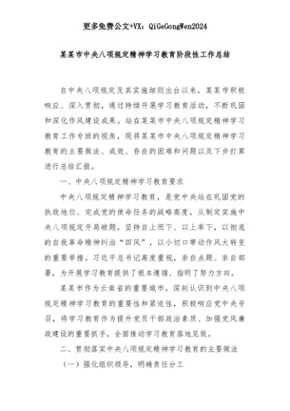 【七哥公文】2025年:某某市中央八项规定精神学习教育阶段性工作总结+更多免费公文+VX:QiGeGongWen2024+更多免费公文+VX:QiGeGongWen2024
