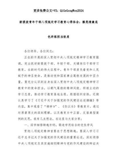 【七哥公文】2025年:新提拔青年干部八项规定学习教育心得体会:擦亮清廉底色淬炼担当铁肩+更多免费公文+VX:QiGeGongWen2024+更多免费公文+VX:QiGeGongWen2024