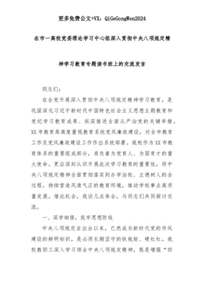 【七哥公文】2025年:在市一高校党委理论学习中心组深入贯彻中央八项规定精神学习教育专题读书班上的交流发言+更多免费公文+VX:QiGeGongWen2024+更多免费公文+VX:QiGeGongWen2024
