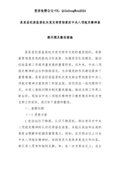 【七哥公文】2025年:某某县纪委监委机关党支部贯彻落实中央八项规定精神查摆问题及整改措施+更多免费公文+VX:QiGeGongWen2024+更多免费公文+VX:QiGeGongWen2024