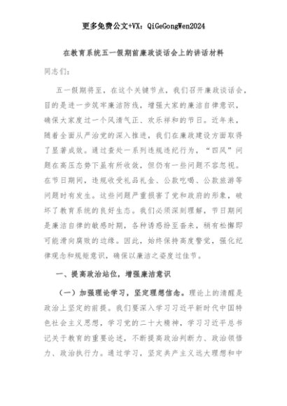 【七哥公文】2025年:在教育系统五一假期前廉政谈话会上的讲话材料+更多免费公文+VX:QiGeGongWen2024+更多免费公文+VX:QiGeGongWen2024