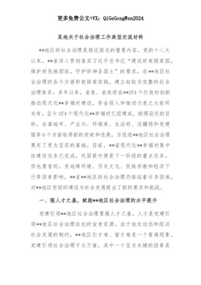 【七哥公文】2025年:某地关于社会治理工作典型交流材料+更多免费公文+VX:QiGeGongWen2024+更多免费公文+VX:QiGeGongWen2024