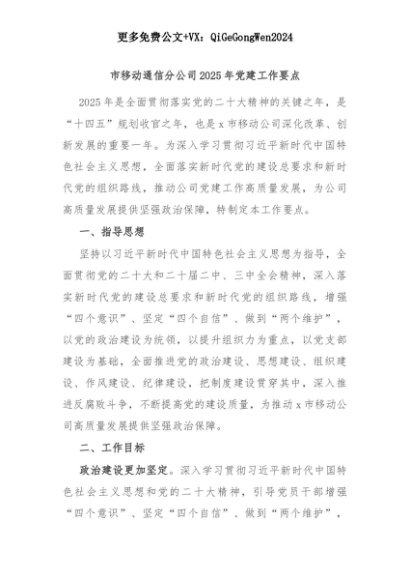 【七哥公文】2025年:市移动通信分公司2025年党建工作要点+更多免费公文+VX:QiGeGongWen2024+更多免费公文+VX:QiGeGongWen2024