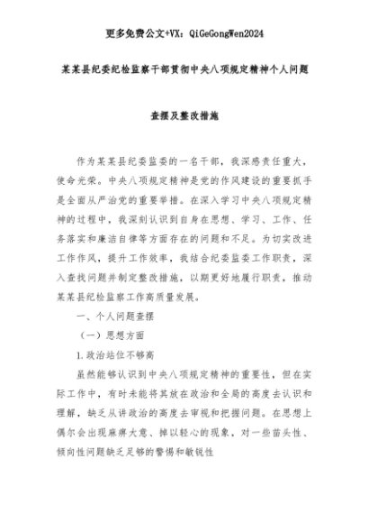 【七哥公文】2025年:某某县纪委纪检监察干部贯彻中央八项规定精神个人问题查摆及整改措施+更多免费公文+VX:QiGeGongWen2024+更多免费公文+VX:QiGeGongWen2024