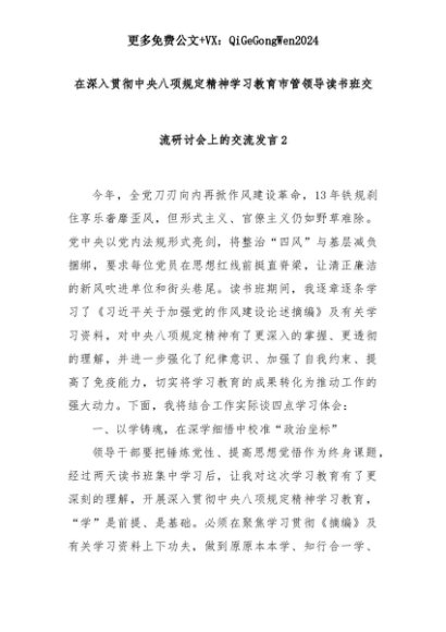 【七哥公文】2025年:在深入贯彻中央八项规定精神学习教育市管领导读书班交流研讨会上的交流发言2+更多免费公文+VX:QiGeGongWen2024+更多免费公文+VX:QiGeGongWen2024