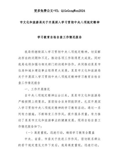 【七哥公文】2025年:市文化和旅游局关于开展深入学习贯彻中央八项规定精神学习教育自检自查工作情况报告+更多免费公文+VX:QiGeGongWen2024+更多免费公文+VX:QiGeGongWen2024