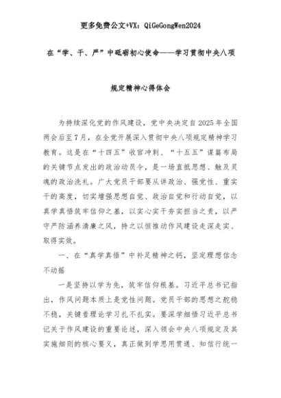 【七哥公文】2025年:在“学、干、严”中砥砺初心使命——学习贯彻中央八项规定精神心得体会+更多免费公文+VX:QiGeGongWen2024+更多免费公文+VX:QiGeGongWen2024