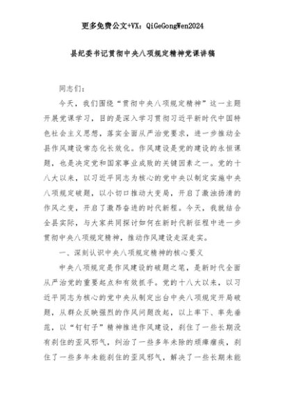 【七哥公文】2025年:县纪委书记贯彻中央八项规定精神党课讲稿+更多免费公文+VX:QiGeGongWen2024+更多免费公文+VX:QiGeGongWen2024