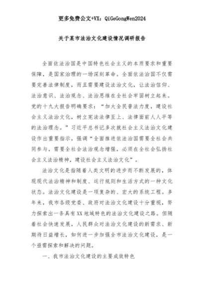 【七哥公文】2025年:关于某市法治文化建设情况调研报告+更多免费公文+VX:QiGeGongWen2024+更多免费公文+VX:QiGeGongWen2024