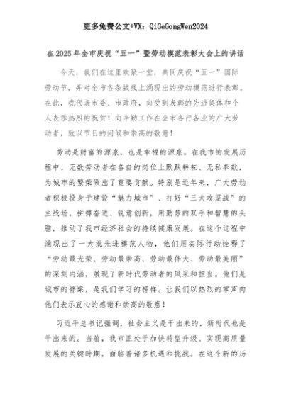 【七哥公文】2025年:在2025年全市庆祝“五一”暨劳动模范表彰大会上的讲话+更多免费公文+VX:QiGeGongWen2024+更多免费公文+VX:QiGeGongWen2024