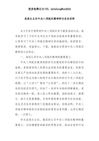 【七哥公文】2025年:县委办主任中央八项规定精神研讨发言材料+更多免费公文+VX:QiGeGongWen2024+更多免费公文+VX:QiGeGongWen2024