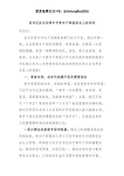 【七哥公文】2025年:县书记在五四青年节青年干部座谈会上的讲话+更多免费公文+VX:QiGeGongWen2024+更多免费公文+VX:QiGeGongWen2024