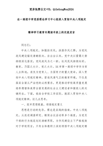 【七哥公文】2025年:在一高级中学党委理论学习中心组深入贯彻中央八项规定精神学习教育专题读书班上的交流发言+更多免费公文+VX:QiGeGongWen2024+更多免费公文+VX:QiGeGongWen2024