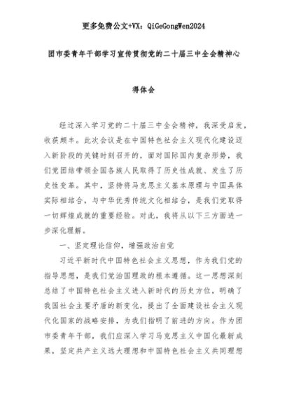 【七哥公文】2025年:团市委青年干部学习宣传贯彻党的二十届三中全会精神心得体会+更多免费公文+VX:QiGeGongWen2024+更多免费公文+VX:QiGeGongWen2024