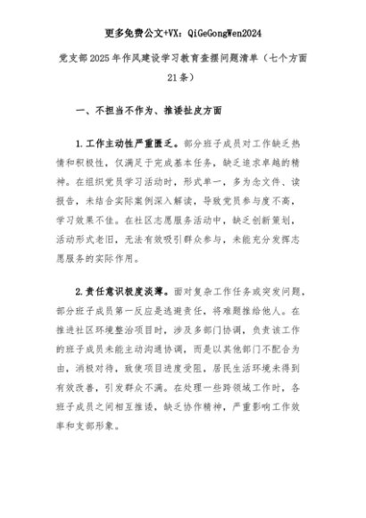 【七哥公文】2025年:党支部2025年作风建设学习教育查摆问题清单(七个方面21条)+更多免费公文+VX:QiGeGongWen2024+更多免费公文+VX:QiGeGongWen2024