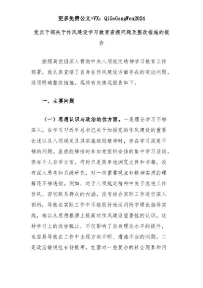 【七哥公文】2025年:党员干部关于作风建设学习教育查摆问题及整改措施的报告+更多免费公文+VX:QiGeGongWen2024+更多免费公文+VX:QiGeGongWen2024