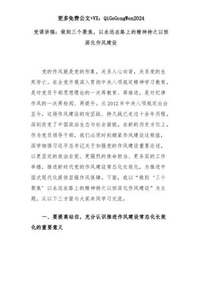【七哥公文】2025年:党课讲稿:做到三个聚焦,以永远在路上的精神持之以恒深化作风建设+更多免费公文+VX:QiGeGongWen2024+更多免费公文+VX:QiGeGongWen2024