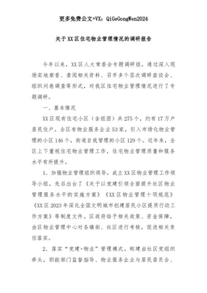 【七哥公文】2025年:关于XX区住宅物业管理情况的调研报告+更多免费公文+VX:QiGeGongWen2024+更多免费公文+VX:QiGeGongWen2024