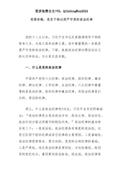 【七哥公文】2025年:党课讲稿:党员干部必须严守党的政治纪律+更多免费公文+VX:QiGeGongWen2024+更多免费公文+VX:QiGeGongWen2024
