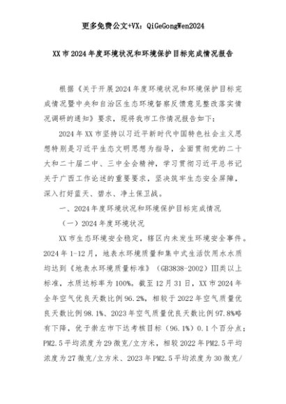 【七哥公文】2025年:XX市2024年度环境状况和环境保护目标完成情况报告+更多免费公文+VX:QiGeGongWen2024+更多免费公文+VX:QiGeGongWen2024