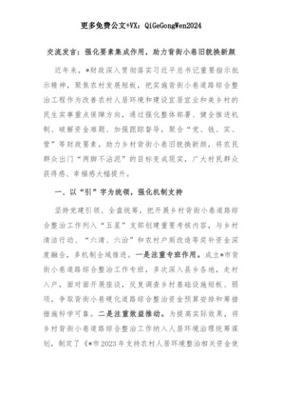 【七哥公文】2025年:交流发言:强化要素集成作用,助力背街小巷旧貌换新颜+更多免费公文+VX:QiGeGongWen2024+更多免费公文+VX:QiGeGongWen2024