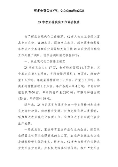 【七哥公文】2025年:XX市农业现代化工作调研报告+更多免费公文+VX:QiGeGongWen2024+更多免费公文+VX:QiGeGongWen2024