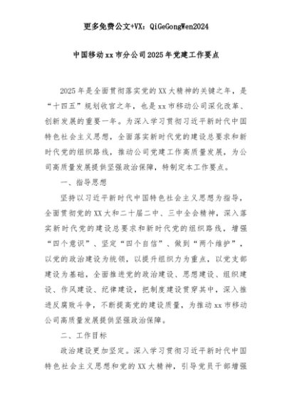 【七哥公文】2025年:中国移动xx市分公司2025年党建工作要点+更多免费公文+VX:QiGeGongWen2024+更多免费公文+VX:QiGeGongWen2024