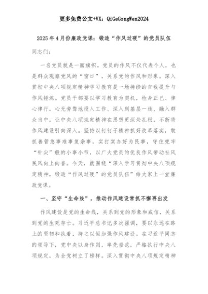 【七哥公文】2025年:2025年4月份廉政党课:锻造“作风过硬”的党员队伍+更多免费公文+VX:QiGeGongWen2024+更多免费公文+VX:QiGeGongWen2024
