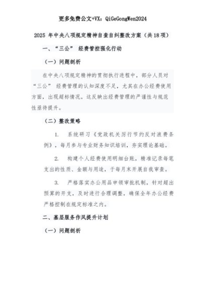 【七哥公文】2025年:2025 年中央八项规定精神自查自纠整改方案(共18项)+更多免费公文+VX:QiGeGongWen2024+更多免费公文+VX:QiGeGongWen2024