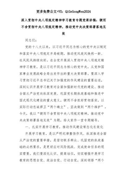 【七哥公文】2025年:深入贯彻中央八项规定精神学习教育专题党课讲稿:锲而不舍贯彻中央八项规定精神,推动党中央决策部署落地见效+更多免费公文+VX:QiGeGongWen2024+更多免费公文+VX:QiGeGongWen2024