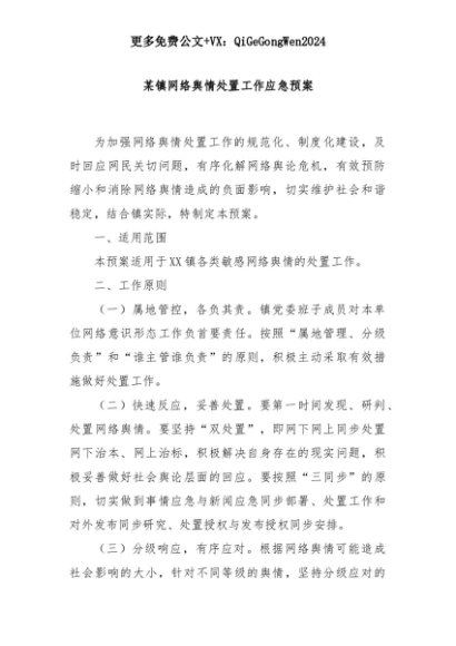 【七哥公文】2025年:某镇网络舆情处置工作应急预案+更多免费公文+VX:QiGeGongWen2024+更多免费公文+VX:QiGeGongWen2024
