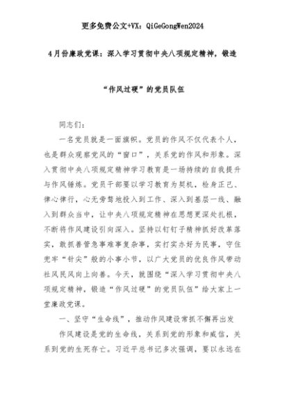 【七哥公文】2025年:4月份廉政党课:深入学习贯彻中央八项规定精神,锻造“作风过硬”的党员队伍+更多免费公文+VX:QiGeGongWen2024+更多免费公文+VX:QiGeGongWen2024
