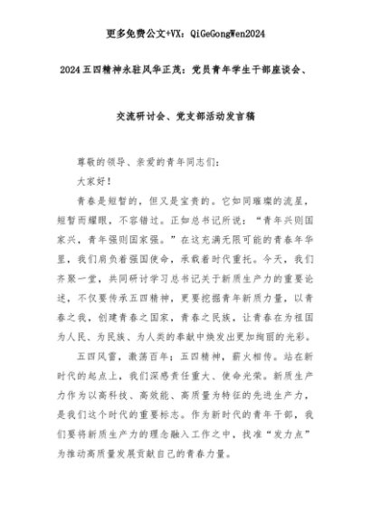 【七哥公文】2025年:2024五四精神永驻风华正茂:党员青年学生干部座谈会、交流研讨会、党支部活动发言稿+更多免费公文+VX:QiGeGongWen2024+更多免费公文+VX:QiGeGongWen2024