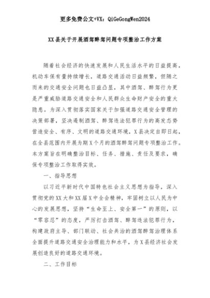 【七哥公文】2025年:XX县关于开展酒驾醉驾问题专项整治工作方案+更多免费公文+VX:QiGeGongWen2024+更多免费公文+VX:QiGeGongWen2024