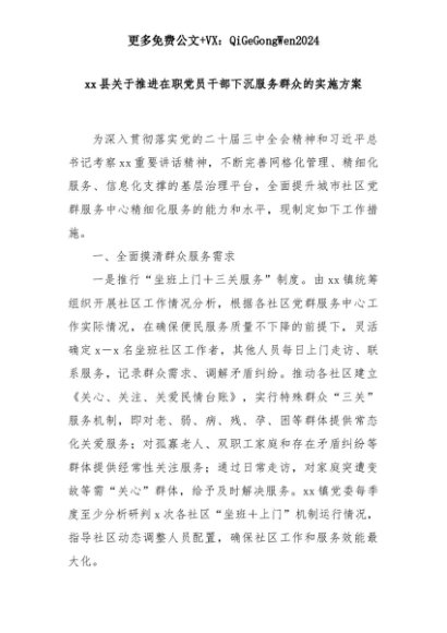 【七哥公文】2025年:xx县关于推进在职党员干部下沉服务群众的实施方案+更多免费公文+VX:QiGeGongWen2024+更多免费公文+VX:QiGeGongWen2024